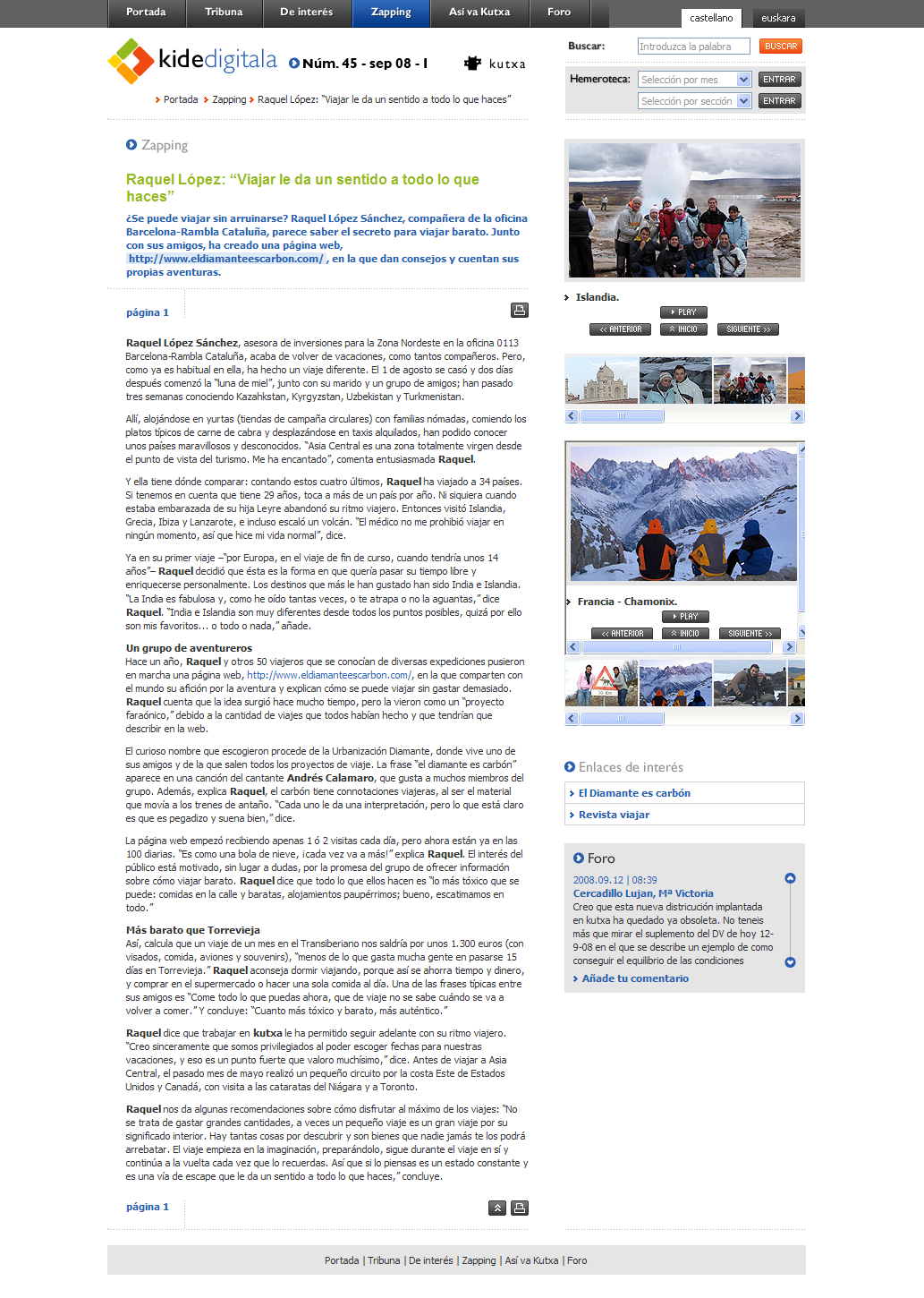 Artículo de eldiamanteescarbon.com publicado en la Intranet de la Kutxa. Se ha enlazado la imagen ya que al ser una intranet no se podia acceder a ella desde Internet. Aqui se exponenen dos paginas con diferentes fotos que se colgaron en la web de la Kutxa, pero son mas las fotos que se metiron. Tampoco se puede acceder a los botones y link´s ya que como hemos dicho es una imagen y no una Web.