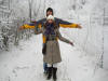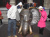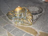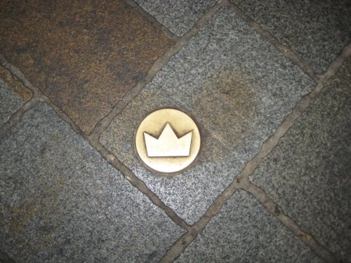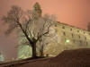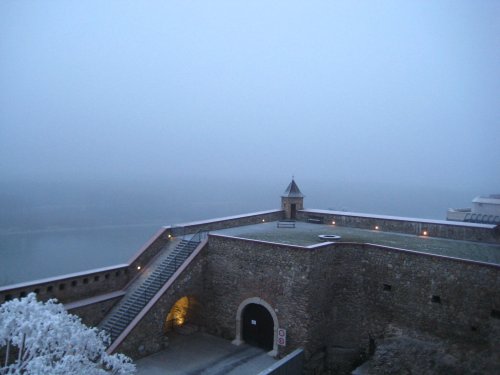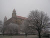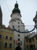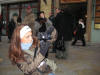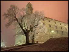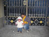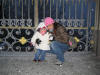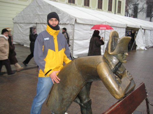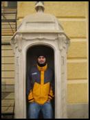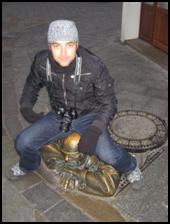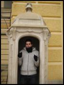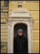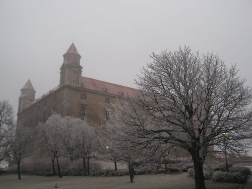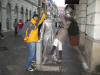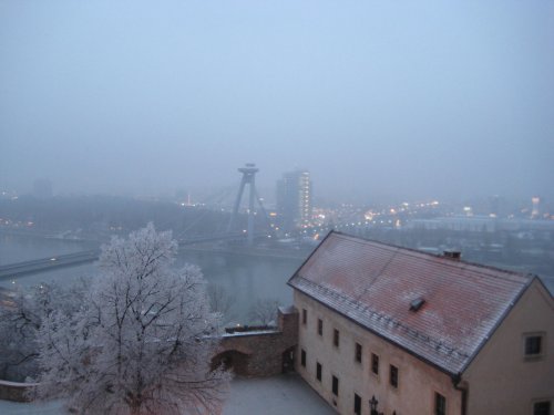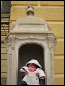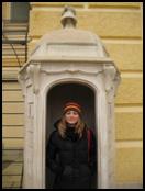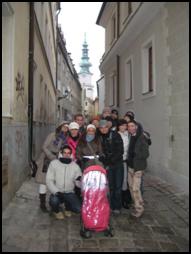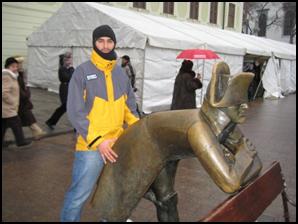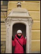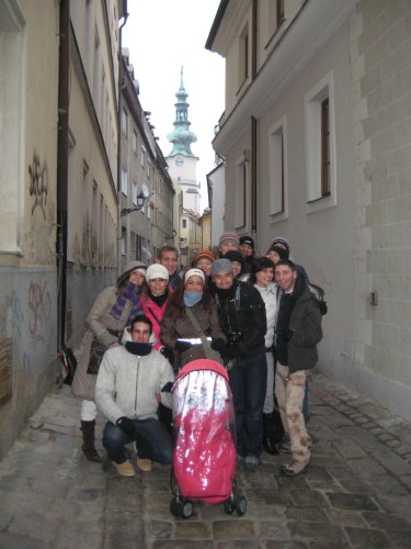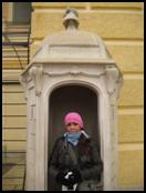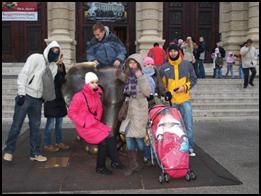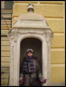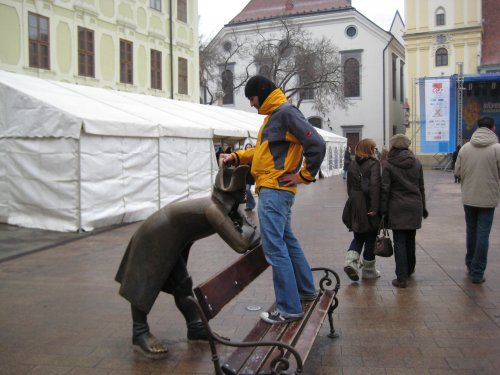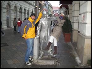 También cerca de la Plaza Mayor, pero esta vez junto a una de las cafeterías más conocidas de la ciudad, encontramos la estatua se Schoner Naci. Su nombre en alemán "significa el bello Ignacio" y nos da una pista sobre las características de este personaje. Schoner Naci fue un antiguo "prespurak", se llamaba así a los habitantes de Prespurk (antiguo nombre de Bratislava), hablando (como era común en la época) eslovaco, alemán y húngaro. Aunque pobre y mentalmente enfermo no descuidó nunca su impecable aspecto, luciendo siempre frac, sombrero de copa, guantes blancos y en sus manos un bastón. Solía frecuentar las cafeterías de la ciudad y siempre saludaba cortésmente a las mujeres jóvenes. Su amabilidad le hizo ganarse la simpatía de los habitantes de la ciudad. La cuarta estatua se nos pasó. Seguímos la ruta para el CASTILLO DE BRATISLAVA, se estaba haciendo de noche y empezaba a nevar, así que nos teníamos que dar brillo… Las ayudas de todos para subir el montón de escaleras con la silla McLaren fueron de gran ayuda…