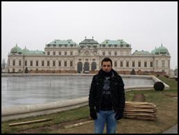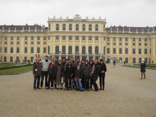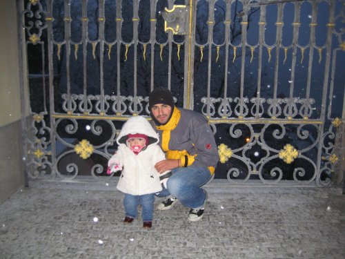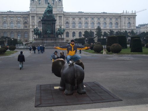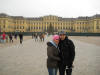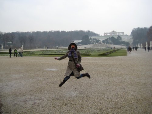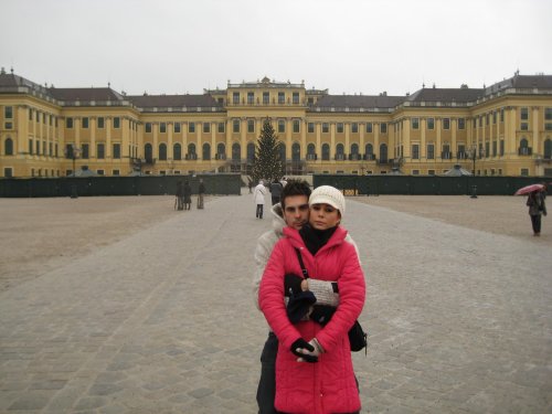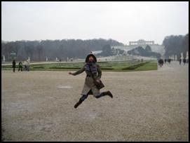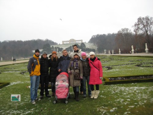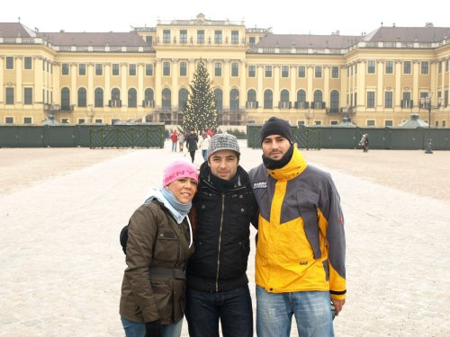 muchos intentos se tuvo que quedar así… Aprovechamos la estampa navideña para hacernos unos Christmas navideños mira Jose Manuel que triumfo… Como siempre hay que reponer fuerzas que mejor que unos perritos o pinchitos de pollo de las casetas típicas… Y claro la peque también tiene que comer en un sitio calentito… recorrimos 3 o 4 mesas pero al final encontramos esta con su calefactor incorporado sino que se lo digan a Pilarin… Y para terminar regresamos como habíamos venido el tren y para casita… o mejor dicho para el hotel que el día había dado bastante de si. DIA 31: Primera visita del día SCHLOSS SCHÖNBRUNN, una mole fría, si cabe imponente, construida para demostrar cuántas habitaciones podía permitirse levantar un gran monarca del barroco bajo un solo techo. Sin embargo, María Teresa lo convirtió en un alegre hogar para sus 12 hijos. Tiene unos grandes jardines con un palmeral y un zoo. Todos juntos en los jardines, Saúl ensayando para un futuro inminente, Pilar dando el gran salto.