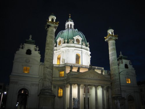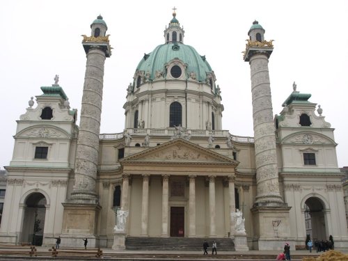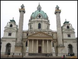 Después de un paseito por los jardines y todo el recinto, cogemos otra vez el metro y nos disponemos a ver la IGLESIA DE SAN CARLOS, o KARLSKIRCHE, uno de los emblemas de Viena. Es admirada por ser uno de los edificios barrocos más hermosos de Europa. Tiene dos columnas trajanas donde se representa la vida de san Carlos Borromeo y el emblema de Carlos IV. Después de dichas visitas nos vamos a comer dentro de la estación donde hemos quedado con el resto del grupo. Exactamente no recuerdo en que estación de metro quedamos pero lo más probable es que fuera Karlsplatz. Y es entonces cuando con nuestro silbido característico nos reunimos toda la trupe.