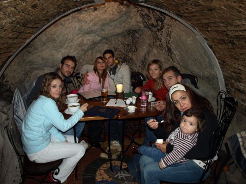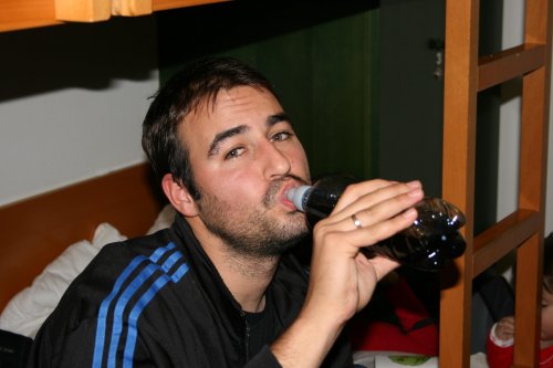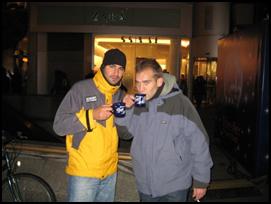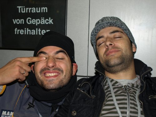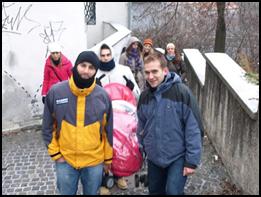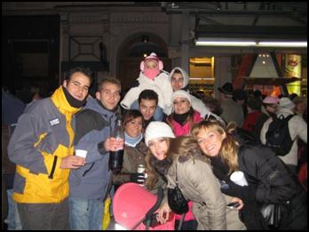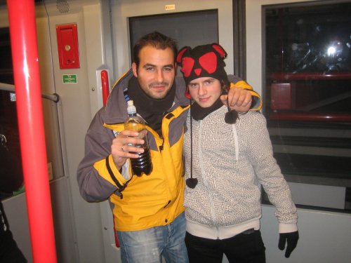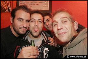 de esta pedazo de gente!!!! Todo estaba lleno de gente y había diferentes escenarios con músicos y baretos para comer y beber y no estaba muy mal de precio, aunque la bebida oficial de la noche fue cervecita y champany para despedir el año como se merecía… ¡¡¡¡¡¡¡¡¡¡¡¡¡¡¡¡¡ FELIZ 2008 !!!!!!!!!!!!! DIA 1: Se que éstos siguieron la fiesta hasta las tantas… y que liaron alguna que otra, aunque siempre de buen rollo y sin altercados importantes… Version de los que nos quedamos (Pilar, Saul, Berta, Cristina, Manolo y Chema): (Nos acercamos Santi y yo a ver si el metro estaba abierto para irse con Leyre y en el trayecto vimos como una chica y su padre discutían con un borracho, pero la cosa no iba a quedar ahí. Cuando volvíamos de ver que el metro esta abierto, vimos como el borracho que estaba discutiendo con la chica y su padre, ya había pasado a las manos y le estaban dando un curron entre ellos 2 y alguno mas que soltaba puñete de vez en cuando. Este, en vez de correr o pirarse, se enfrentaba a ellos encajando como un autentico sparrin, gritándoles cosas raras que el solo entendía. Santi y yo flipando corrimos a contárselo al resto. El resto nos miraba como si de una trama mas se tratara, pero claro, esta vez era cierto y estaban, sin saberlo, apunto de caer en las manos del borracho suicida. Como decía, rato después, apareció el borracho suicida en nuestro grupo, pero Santi y Raquel ya no estaban. Que personaje mas raro, no paraba de decir que el conocía a Bin Laden y que sabia donde vivía, justo encima de donde estábamos, decía. Entonces, invente una canción un poco rara, pero que con ritmillo puede quedar mucho mejor, ahí va: Where is Bin Laden, I don´t know. Where is Bin Laden, I don´t know. Es un poco repetitiva, pero si vas trompa y empiezas a dar botes con el borracho, se hace mas ameno ejejejej Luego, cuando nos desicimos de el y de la guerra campal de petardos y cohetes que habían caído en Stephansplatz, nos dimos una vuelta a ver si alguien nos asesoraba para entrar en algún palacio gratis. En el camino encontramos la luz, un puesto de información abierto en nochevieja a la 1 de la noche.El puesto de información estaba formado por 2 pardos muy atentos y amables. Si soy sincero, nos aprovechamos de ellos. El puesto estaba lleno de panfletos de publicidad, cuando digo lleno hablo de montañas de mas o menos medio metro. No se nos podía ocurrir nada bueno, y asi fue, Berta empezó a coger los panfletos en cantidades industriales y a tirárselo a los dos mientras hablaban y daban información a otros turistas. El despolle fue pequeño, el menda no daba crédito a lo que veía, un grupo de Españoles tirandole mil panfletos a la cara. Impresionante... menos mal que tenemos un video para corroborarlo. Después seguimos dando por culo al informador, y le dijimos que si se bebia la media botella de 2 litros que teníamos llena de whisky 2/3 y coca-cola 1/3 (increíble) le dejábamos en paz. Como dato diré, que Saúl y yo no nos lo podíamos beber, pues el chico de la información, el cual creíamos que era un pardo, se lo bebió de un trago, sin respirar, casi un litro entero de whisky con coca-cola cargadisisimo, no dábamos crédito a nuestros ojos..... repito impresionante, se gano nuestro respeto y nos fuimos a un garito, no antes sin hacerle alguna coñita de señalar con los dedos de todos nosotros donde el ponía el suyo al contarle a alguien que era lo que tenia que ver en el mapa.Mas tarde nos fuimos a un garito en el que sucedió algo espectacular, Saúl encontró su media naranja. Esa media naranja era un negro mariquita que le decia a Saúl de ir a follar en ese mismo momento a su casa. Que le gustaba mucho. Hablaron de todo y fue la polla, Saúl aguanto el tipo como un autentico crack. No contare mas pero bueno, yo algun magreo si que vi ejejejeje. Mas tarde y mas borrachos que nada, nos fuimos para el albergue. No hay más pruebas fotográficas pero solo hay que juzgar las caras…por cierto la morena es una agregá… Y al día siguiente la consabida despedida cada mochuelo a su hoyuelo (Madrid – Barcelona) y hasta el próximo que no tardará… No es que hayamos visto mucho de Viena y Bratislava, pero lo importante de los viajes aparte de sorprenderte por las cosas nuevas que ves, es la gente con quien lo compartes, para así poder estar viajando cada vez que nos juntamos y recordamos.