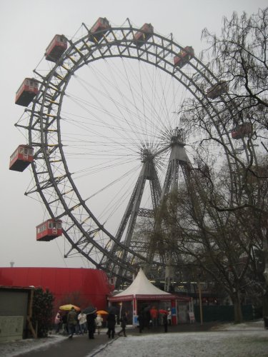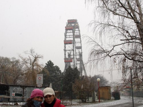 La siguiente parada fue LA NORIA DE PRATER, la gigantesca noria (construida en 1896 por el inglés Walter Bassett) fue el escenario del encuentro de Harry Lime con su antiguo amigo en la película “El tercer hombre”. La noria gira a razón de 75 cm por segundo y ofrece vistas espectaculares de la ciudad. Mientras discutíamos sobre un tema trascendental: “Los cuernos” y cada uno ofrecía su diferente punto de vista al respecto, siguiendo así con las consabidas discursiones… nos empezó a nevar de forma importante… faltaban unas pocas horas para acabar el año, así que mejor manera…