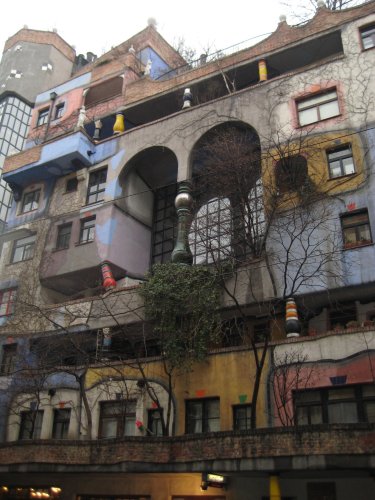 Desde allí dimos un paseo rodeando el Danubio para llegar a HUNDERTWASSERHAUS. Es un bloque de viviendas muy peculiar, por sorprendente que parezca, este original edificio, no es una galería de arte ni una atracción infantil, sino un bloque residencial para familias de clase media. Diseñada por el pintor que le da nombre, célebre por sus libertades creativas, la casa tuvo que ser rehabilitada antes de ser utilizada como vivienda. Frente a este edificio está Kalke Village, una galería comercial diseñada en el mismo estilo, y que tiene unos originales baños. Ahí estuvimos tomando algo.