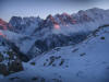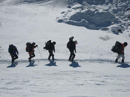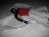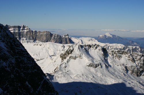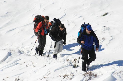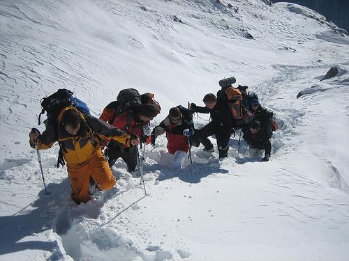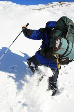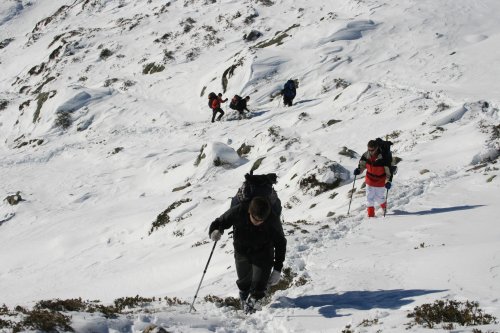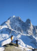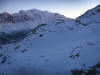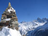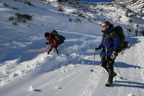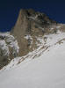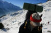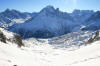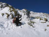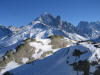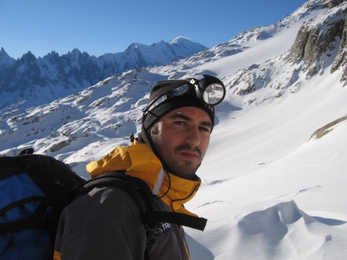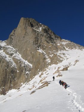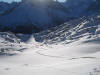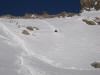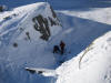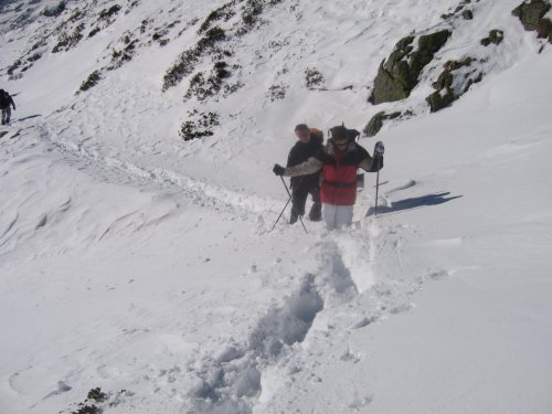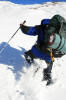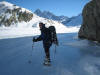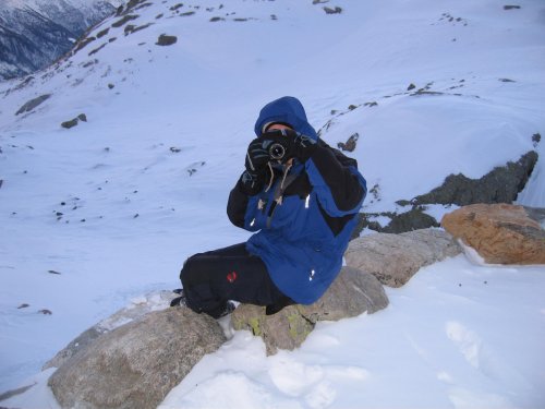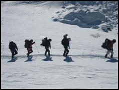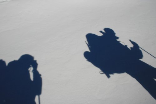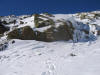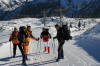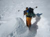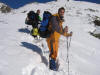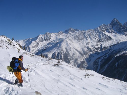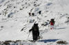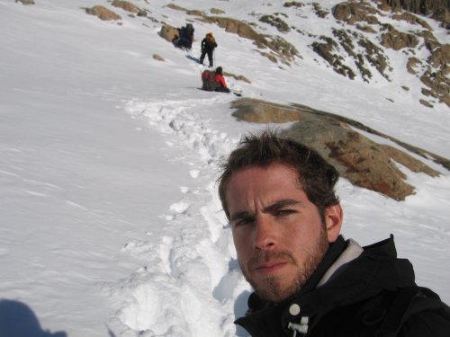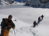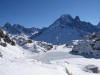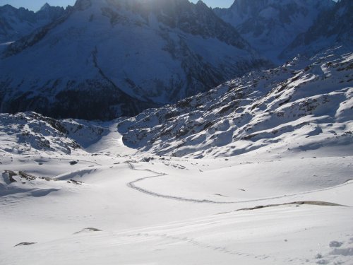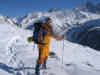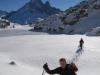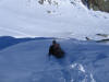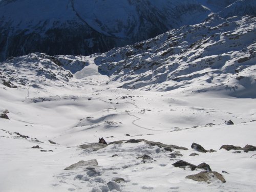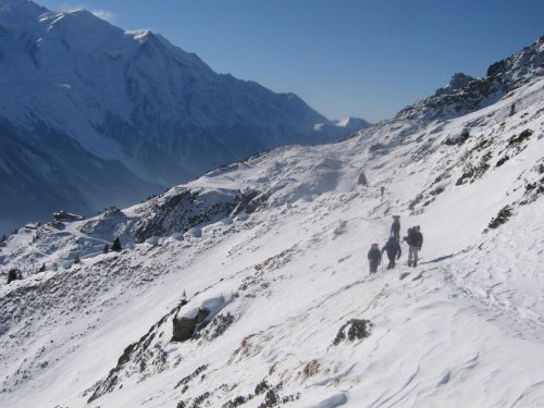 La primera parte de la ascensión, hasta Flégère a 1877 m la hicimos en un telecabina de esos rojitos, típicos alpinos, que subía empinadísimo para librar la primera parte del valle de Chamonix y una vez arriba, AAAAAAUUUUUUUU, un panorama espectacular, nada de viento, ni una sola nube, y todo el macizo del Mont Blanc saludándonos desde el otro lado del valle. Desde aquí empezaba el camino hacia el Lac blanc, la subida fue otra de las heroicas gestas aluchinas, una fuerte pendiente, y un metro de crema (nieve) de primerísima calidad recién caída. Solo estaban las huellas de una persona (que ese si que estaba obcecado) que iba delante de nosotros. Aunque sus huellas no nos facilitaban el avance, por lo menos ya sabíamos cual era el camino a seguir. Esa profundidad de nieve requería raquetas a gritos, pero por supuesto no teníamos... hubiera sido demasiado fácil. La subida fue una batalla desigual que diezmo las fuerzas (pero nunca la determinación) del equipo. ![]() ![]() ![]()