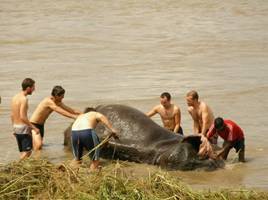 frotándoles con hierba y hojas por el lomo y las patas. Los elefantes