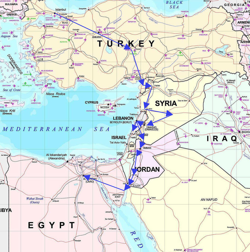 Recorrio Oriente Proximo y mapas de Egipto, Israel, Jordania, Libano, Sria, Turquia y Oriente Proximo. GENERAL Compañía donde alquilamos el transporte de Siria, Libano y Jordania, en MOSAIC: http://www.mosaic-travel.com/ TURQUIA Hostel de Estambul, Nobel Guest House, conocido por sus Protozosss, este sitio da cultura: http://www.nobelguesthouse.com/ Estacion de Buses de Estambul, Buyuk Otogar: http://www.turkeytravelplanner.com/go/Istanbul/Transport/IstanbulOtogar.html Goreme nacional park UNESCO: http://whc.unesco.org/en/list/357